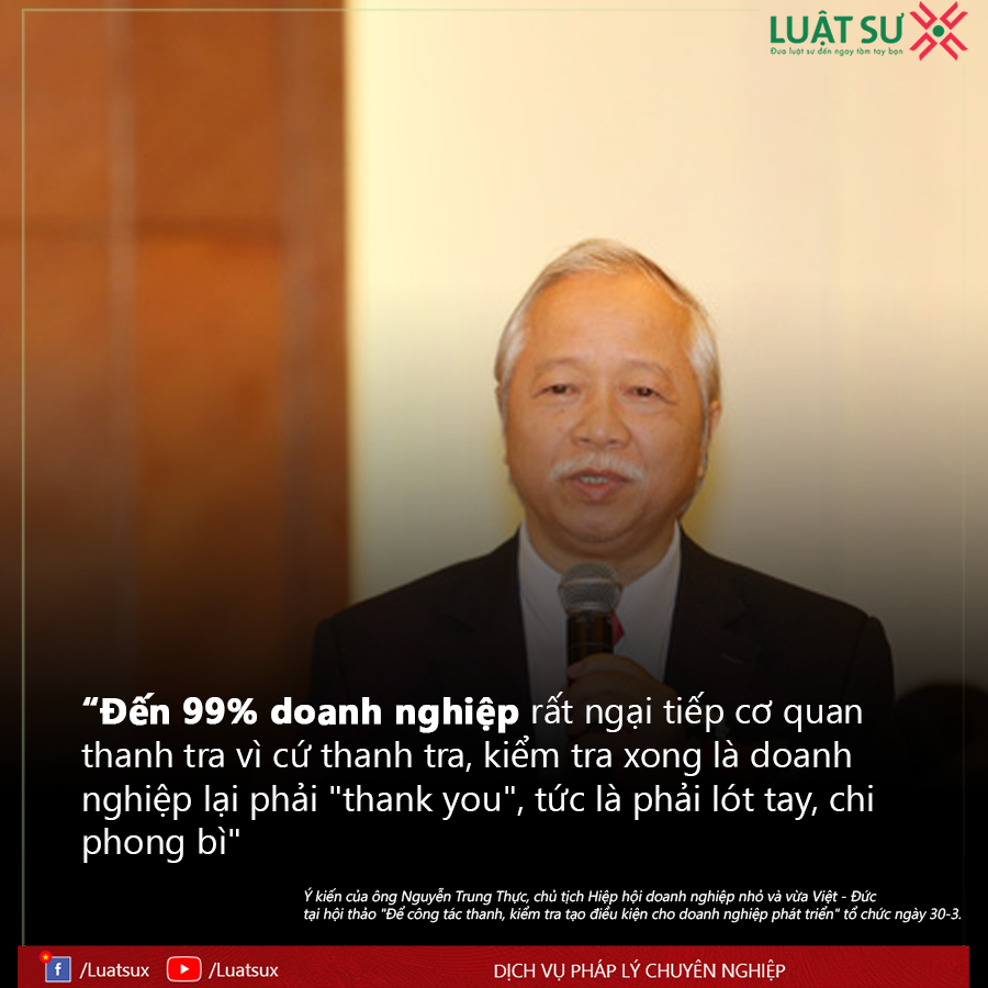 TTO – “Đến 99% doanh nghiệp rất ngại tiếp cơ quan thanh tra vì cứ thanh tra, kiểm tra xong là doanh nghiệp lại phải “thank you”, tức là phải lót tay, chi phong bì”.
