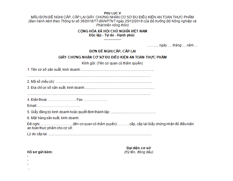 - Đơn đề nghị cấp Giấy chứng nhận an toàn thực phẩm theo mẫu tại Phụ lục V ban hành kèm theo Thông tư 38/2018/TT-BNNPTNT