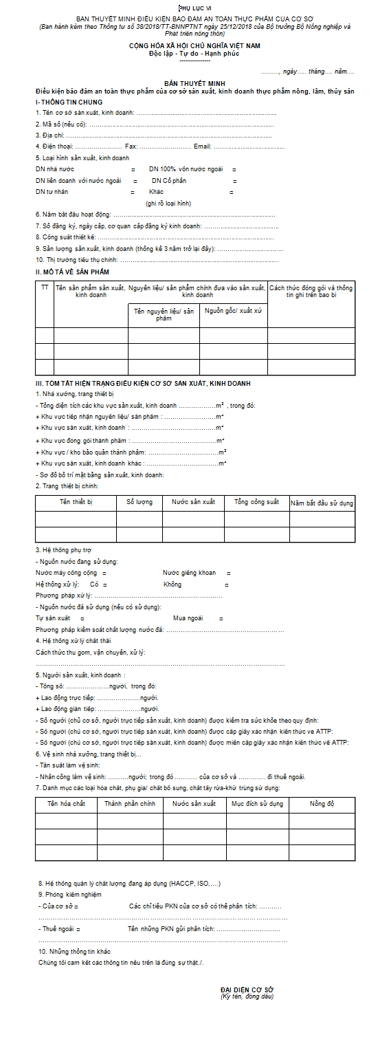 - Bản thuyết minh về điều kiện bảo đảm an toàn thực phẩm của cơ sở theo Phụ lục VI ban hành kèm theo Thông tư 38/2018/TT-BNNPTNT