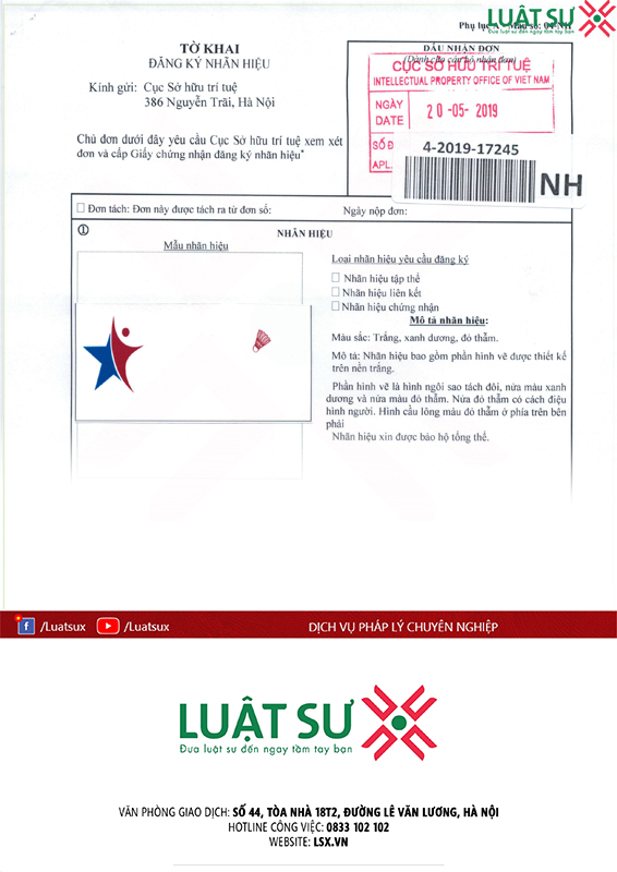 Ngày 20/05/2019, đội ngũ Chuyên viên pháp lý của LSX đã hoàn thiện hồ sơ xin đăng kí bảo hộ nhãn hiệu và gửi tới anh Thuận xác nhận nộp đơn hợp lệ do Cục sở hữu trí tuệ xác nhận. Nhãn hiệu của anh Thuận sẽ chính thức được bảo hộ sau thời gian quy định của pháp luật.