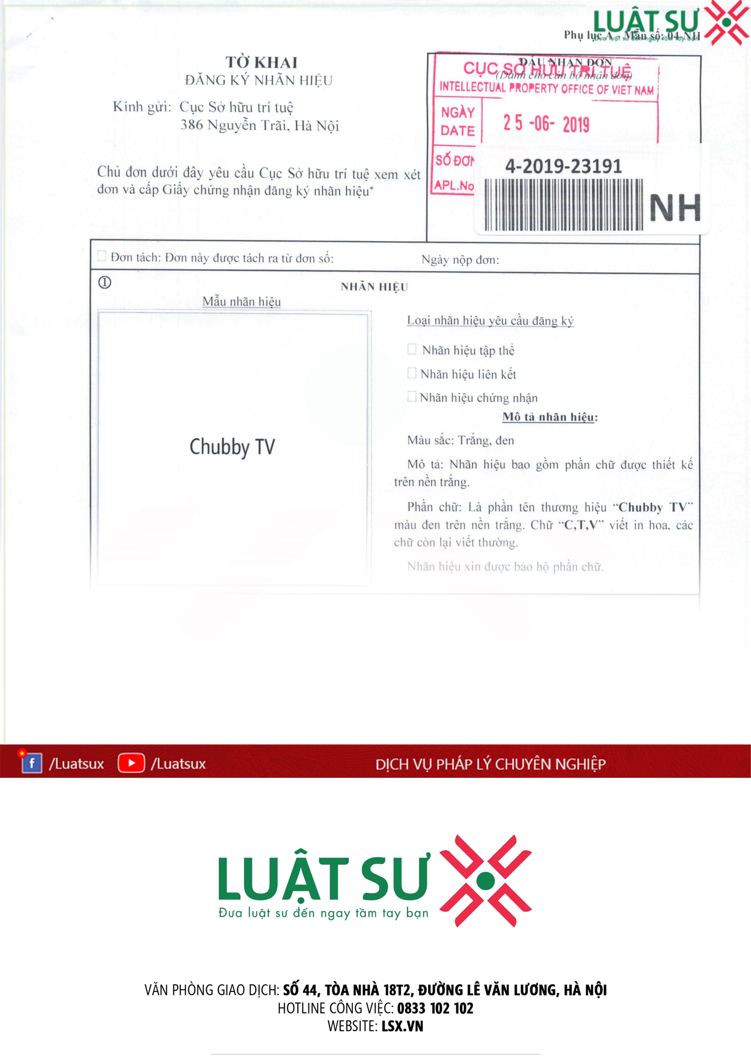 Ngày 25/06/2019 Chuyên viên pháp lý của LSX đã hoàn thiện hồ sơ xin đăng kí bảo hộ nhãn hiệu và gửi tới anh Bảo xác nhận nộp đơn hợp lệ do Cục sở hữu trí tuệ xác nhận. Nhãn hiệu “CHUBBY TV” của Anh sẽ chính thức được bảo hộ sau thời gian quy định của pháp luật.