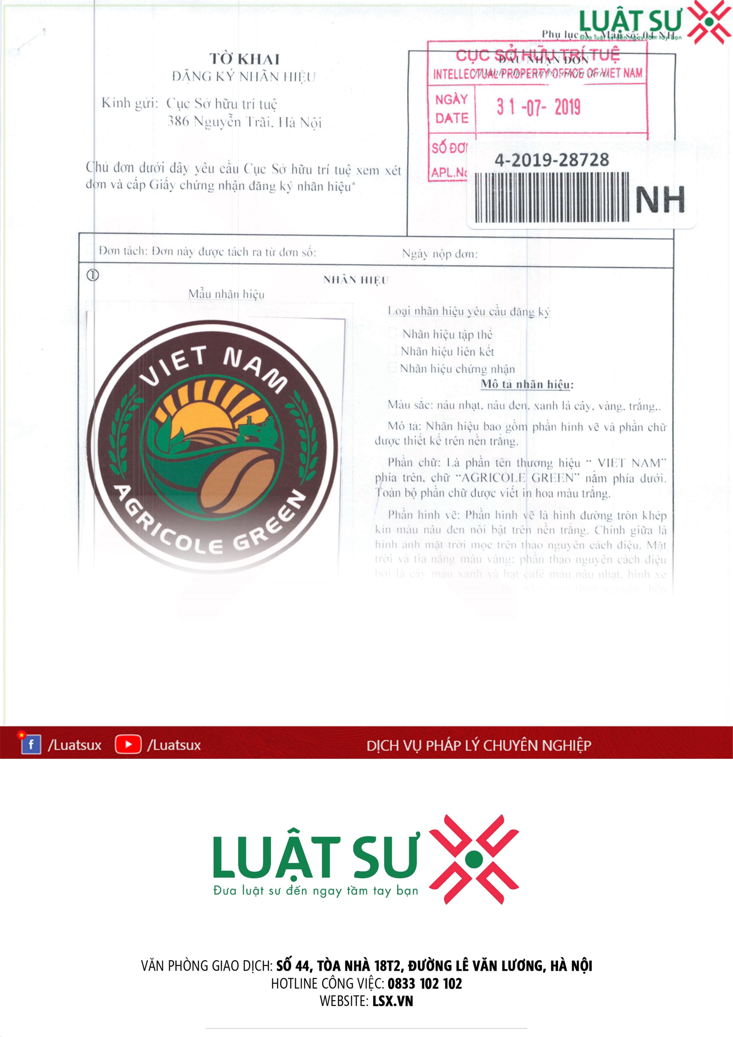 Ngày 31/07/2019 Chuyên viên pháp lý của LSX đã hoàn thiện hồ sơ xin đăng kí bảo hộ nhãn hiệu và gửi tới anh xác nhận nộp đơn hợp lệ do Cục sở hữu trí tuệ xác nhận. Nhãn hiệu LOGO AGRICOLE GREEN VIETNAM của chị sẽ chính thức được bảo hộ sau thời gian quy định của pháp luật.