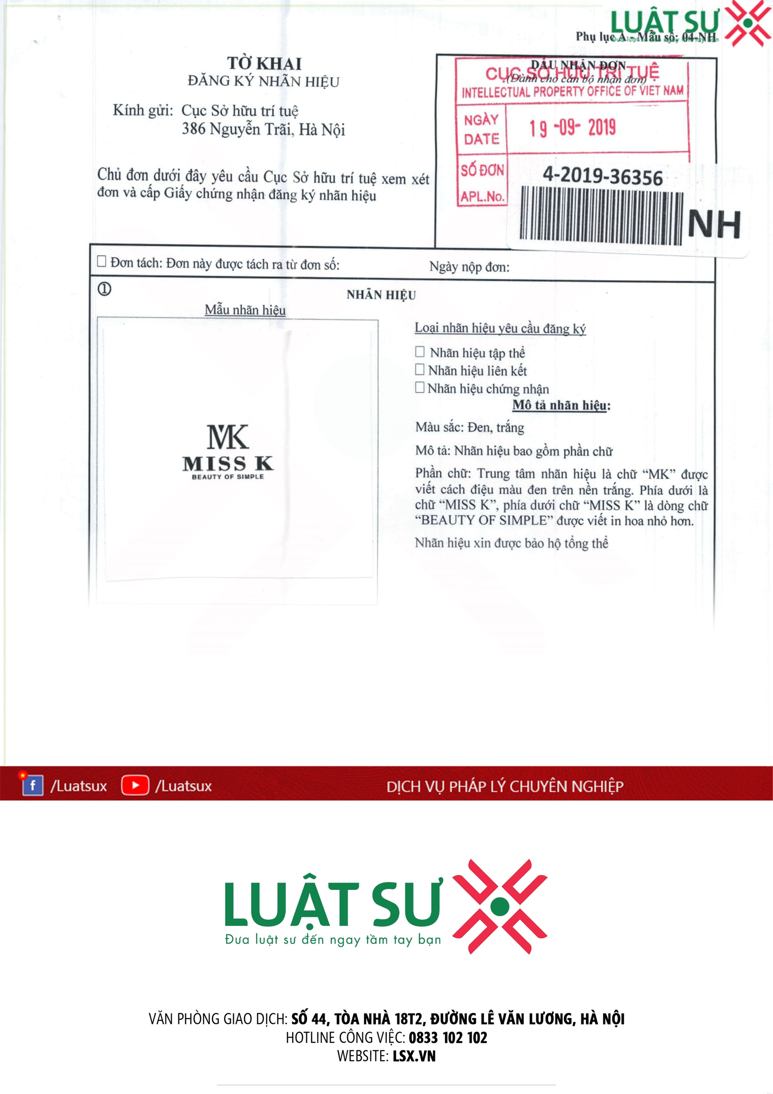 Ngày 19/09/2019 Chuyên viên pháp lý của LSX đã hoàn thiện hồ sơ xin đăng kí bảo hộ nhãn hiệu và gửi tới anh xác nhận nộp đơn hợp lệ do Cục sở hữu trí tuệ xác nhận. Nhãn hiệu “LOGO MK” của anh sẽ chính thức được bảo hộ sau thời gian quy định của pháp luật.
