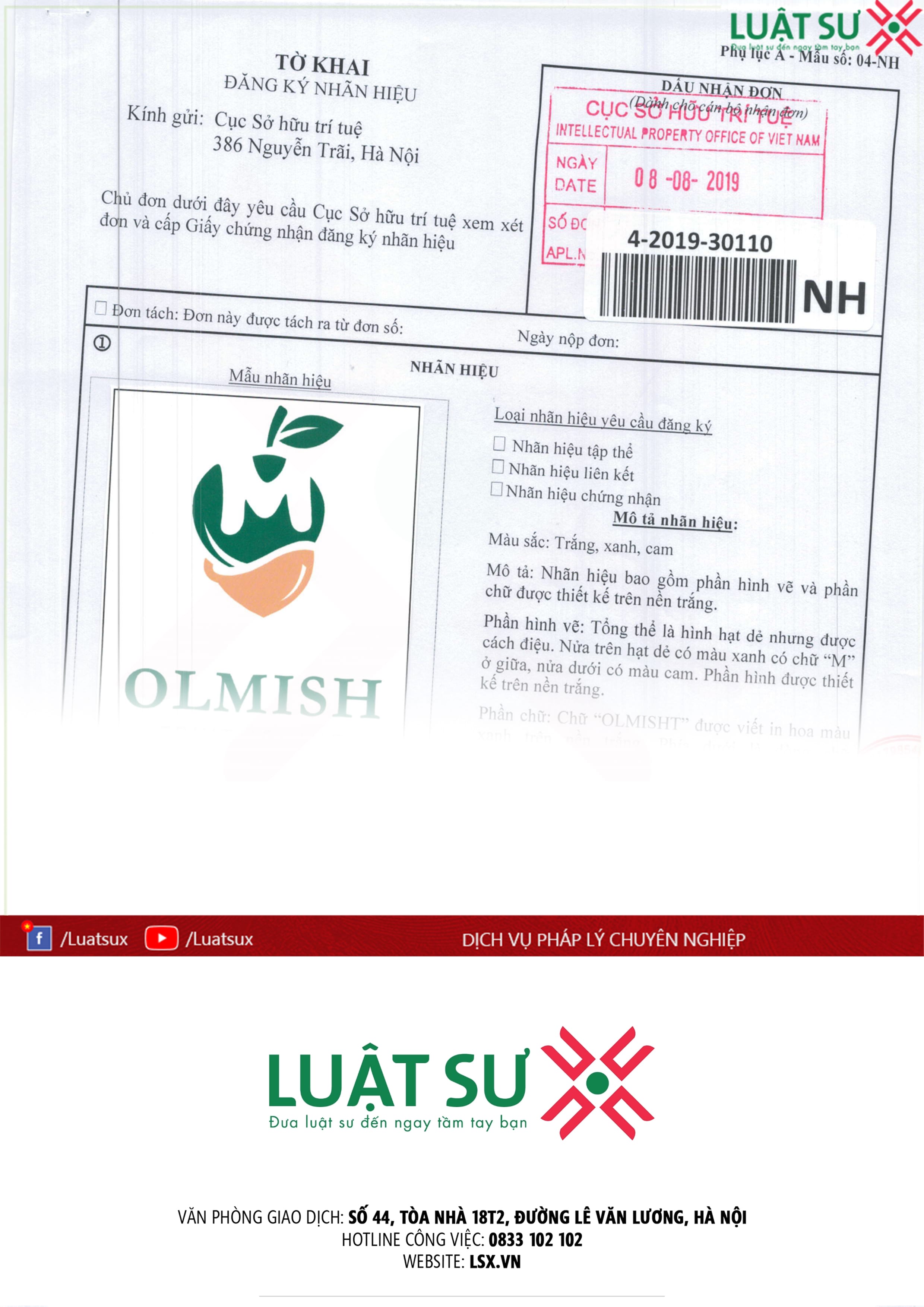 Ngày 08/08/2019 Chuyên viên pháp lý của LSX đã hoàn thiện hồ sơ xin đăng kí bảo hộ nhãn hiệu và gửi tới anh xác nhận nộp đơn hợp lệ do Cục sở hữu trí tuệ xác nhận. Nhãn hiệu “LOGO OLMISH” của anh sẽ chính thức được bảo hộ sau thời gian quy định của pháp luật.