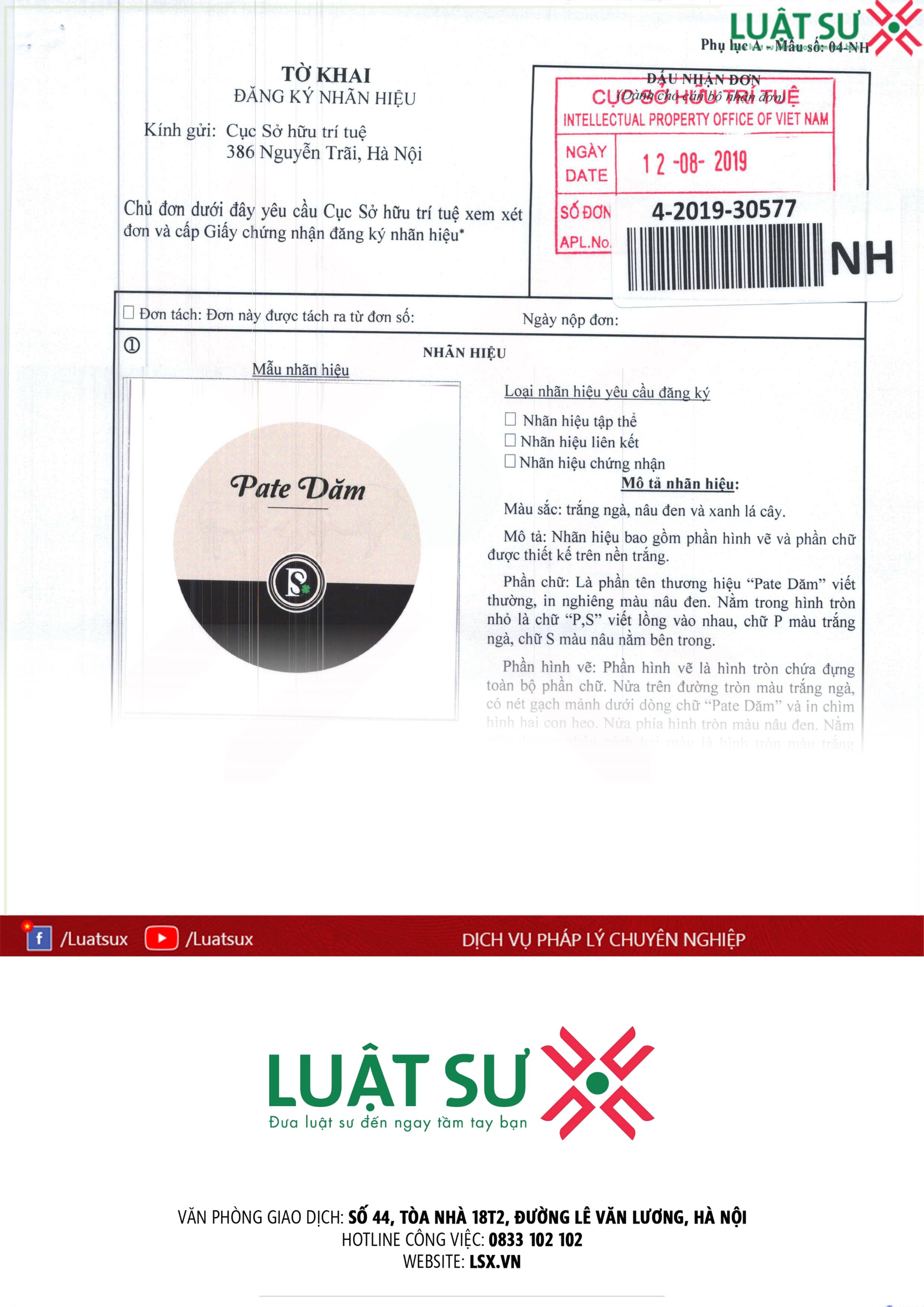 Ngày 12/08/2019 Chuyên viên pháp lý của LSX đã hoàn thiện hồ sơ xin đăng kí bảo hộ nhãn hiệu và gửi tới anh xác nhận nộp đơn hợp lệ do Cục sở hữu trí tuệ xác nhận. Nhãn hiệu “LOGO PATE DĂM” của chị sẽ chính thức được bảo hộ sau thời gian quy định của pháp luật.