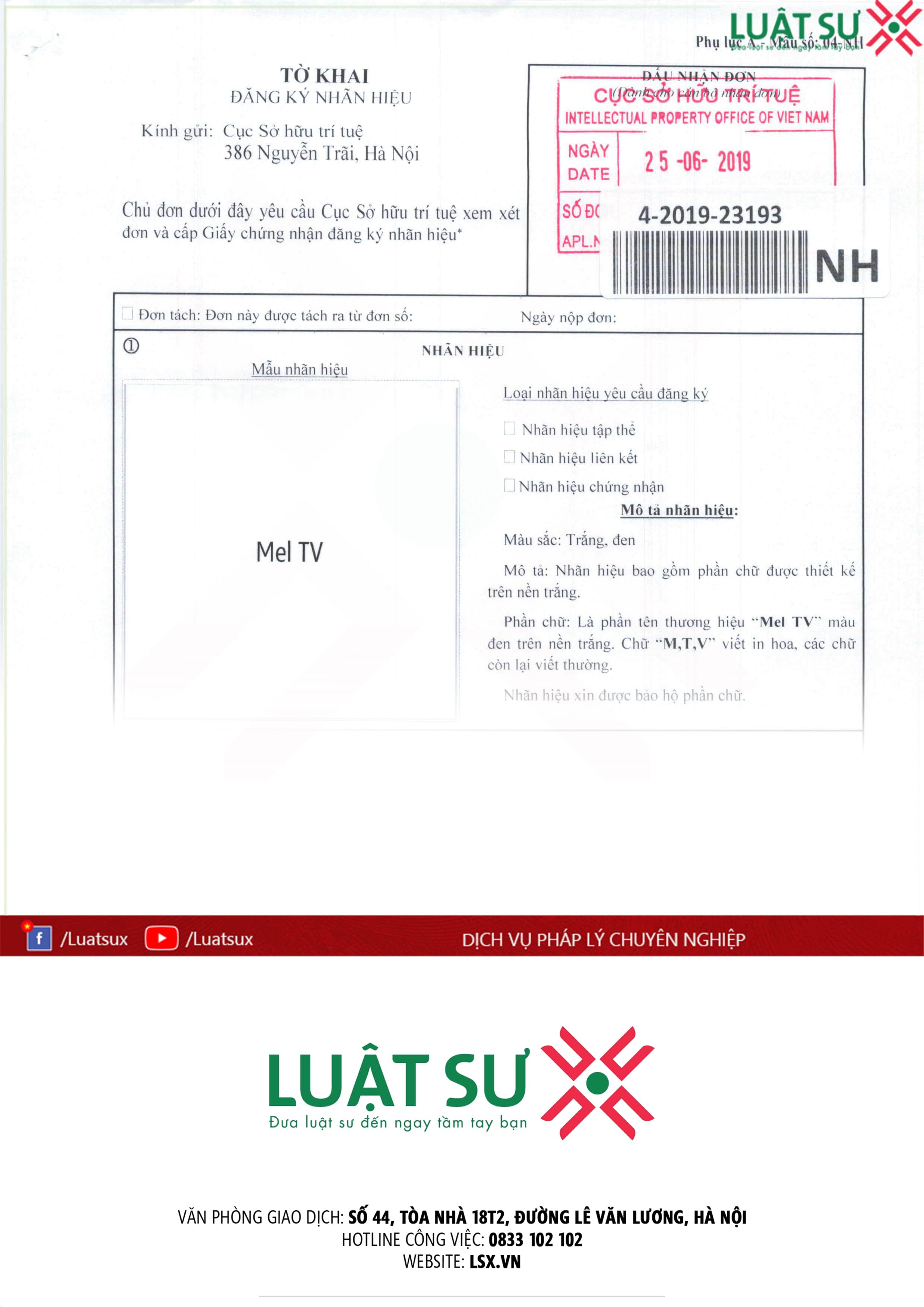 Ngày 25/06/2019 Chuyên viên pháp lý của LSX đã hoàn thiện hồ sơ xin đăng kí bảo hộ nhãn hiệu và gửi tới anh Bảo xác nhận nộp đơn hợp lệ do Cục sở hữu trí tuệ xác nhận. Nhãn hiệu “MEL TV” của Anh sẽ chính thức được bảo hộ sau thời gian quy định của pháp luật.