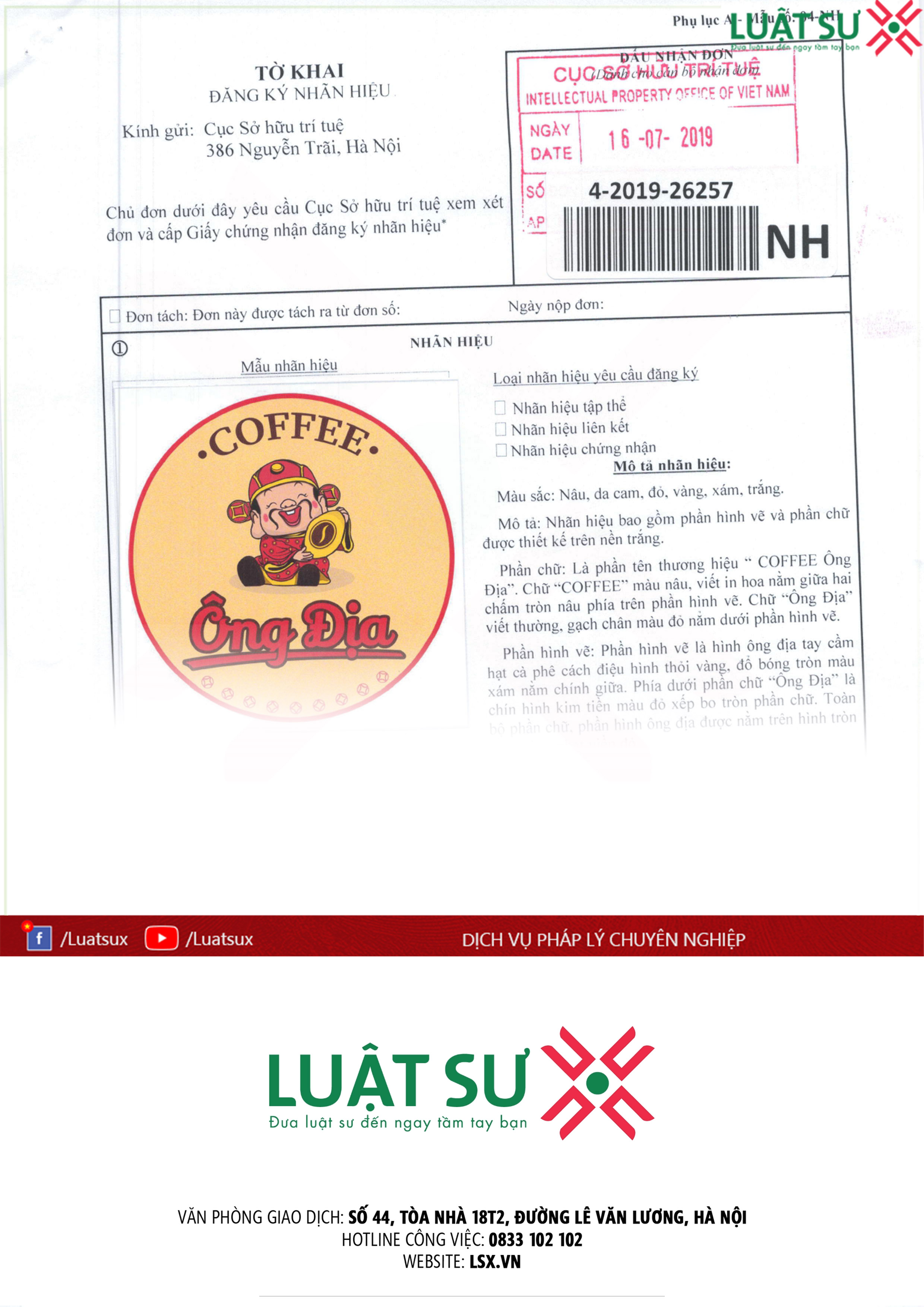 Ngày 16/07/2019 Chuyên viên pháp lý của LSX đã hoàn thiện hồ sơ xin đăng kí bảo hộ nhãn hiệu và gửi tới anh Khánh xác nhận nộp đơn hợp lệ do Cục sở hữu trí tuệ xác nhận. Nhãn hiệu “ÔNG ĐỊA COFFEE” của Anh sẽ chính thức được bảo hộ sau thời gian quy định của pháp luật.