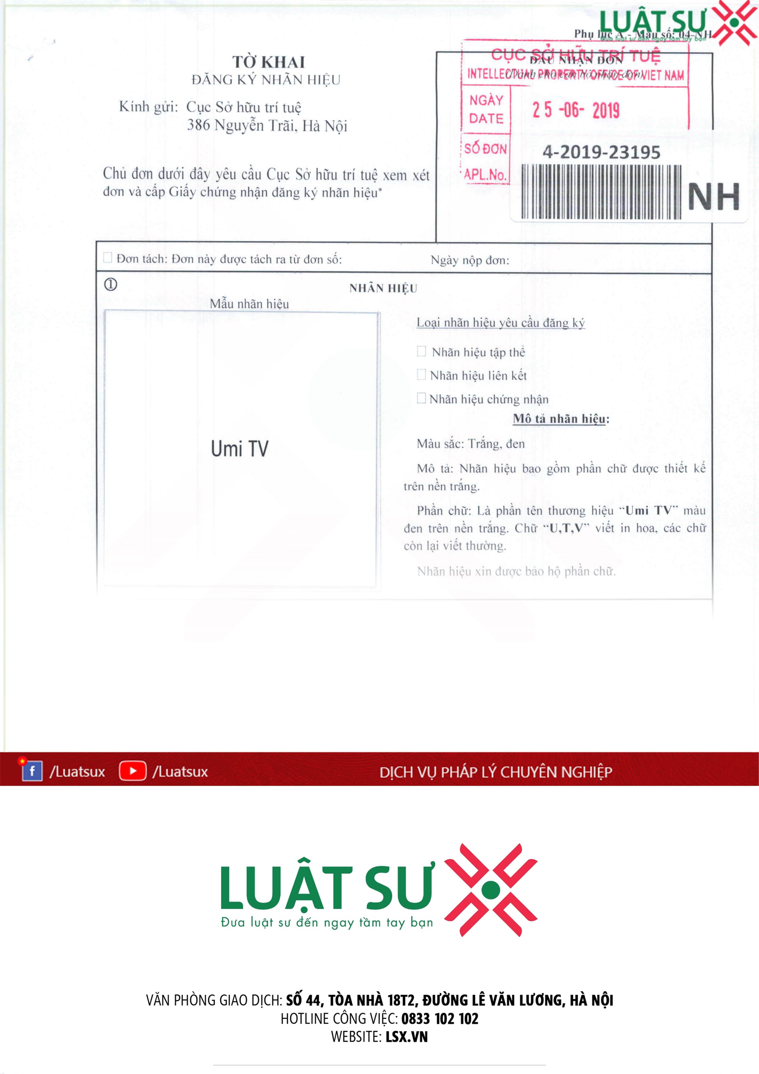 Ngày 25/06/2019 Chuyên viên pháp lý của LSX đã hoàn thiện hồ sơ xin đăng kí bảo hộ nhãn hiệu và gửi tới anh Bảo xác nhận nộp đơn hợp lệ do Cục sở hữu trí tuệ xác nhận. Nhãn hiệu “UMI TV” của Anh sẽ chính thức được bảo hộ sau thời gian quy định của pháp luật.