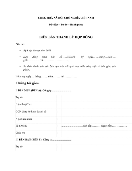 Dưới đây là mẫu của biên bản thanh lý hợp đồng mới nhất: