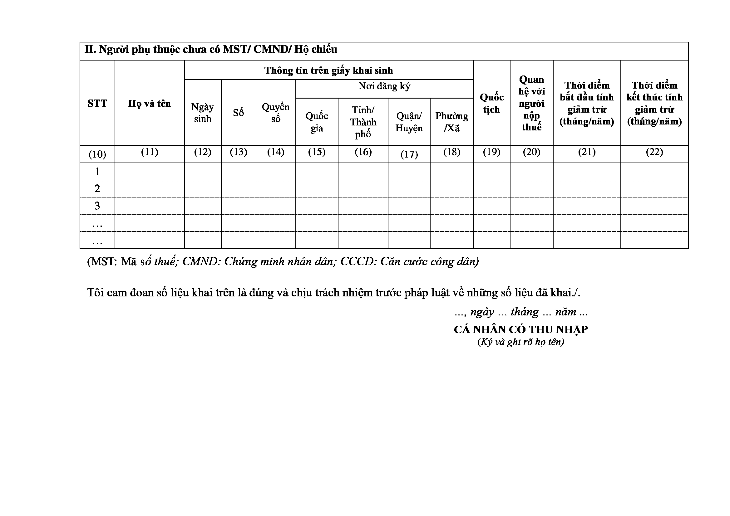 * Lưu ý: Trong vòng ba (03) tháng kể từ ngày nộp tờ khai đăng ký người phụ thuộc (bao gồm cả trường hợp đăng ký thay đổi người phụ thuộc), cá nhân nộp thuế phải nộp hồ sơ chứng minh người phụ thuộc đầy đủ theo pháp luật để được giảm trừ.
