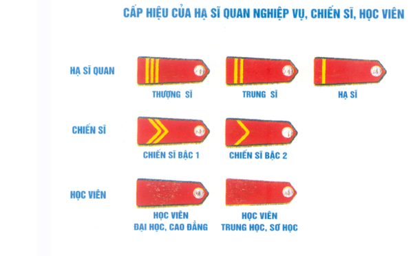 Mỗi cấp bậc của các chiến sĩ công an nhân dân tương ứng với các lon/quân hàm mà chiến sĩ đó đeo trên vai. Cụ thể như sau: