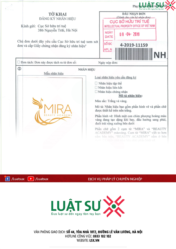 Ngày 08/04/1019, Chuyên viên pháp lý của LSX chính thức hoàn tất hồ sơ xin đăng ký bảo hộ nhãn hiệu và gửi đến chị Nguyễn Ngọc Quỳnh Anh xác nhận nộp đơn hợp lệ do Cục sở hữu trí tuệ xác nhận. Nhãn hiệu “ MIRA BEAUTY ACADEMY” của chị Quỳnh Anh sẽ chính thức được bảo hộ sau thời gian quy định của pháp luật.