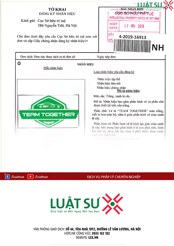 Ngày 17/05/2019, đội ngũ Chuyên viên pháp lý của LSX đã hoàn thiện hồ sơ xin đăng kí bảo hộ nhãn hiệu và gửi tới anh Phương xác nhận nộp đơn hợp lệ do Cục sở hữu trí tuệ xác nhận. Nhãn hiệu “TEAM TOGETHER” của anh Phương sẽ chính thức được bảo hộ sau thời gian quy định của pháp luật.