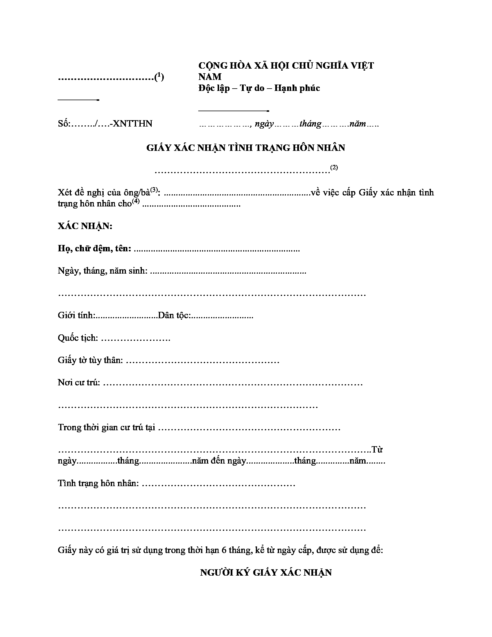 - Tờ khai đăng ký kết hôn theo mẫu;