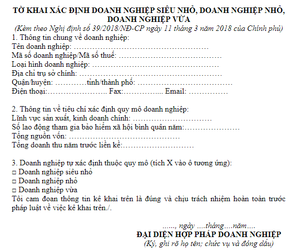TỜ KHAI XÁC ĐỊNH DOANH NGHIỆP SIÊU NHỎ, DOANH NGHIỆP NHỎ, DOANH NGHIỆP VỪA (Kèm theo Nghị định số 39/2018/NĐ-CP ngày 11 tháng 3 năm 2018 của Chính phủ)