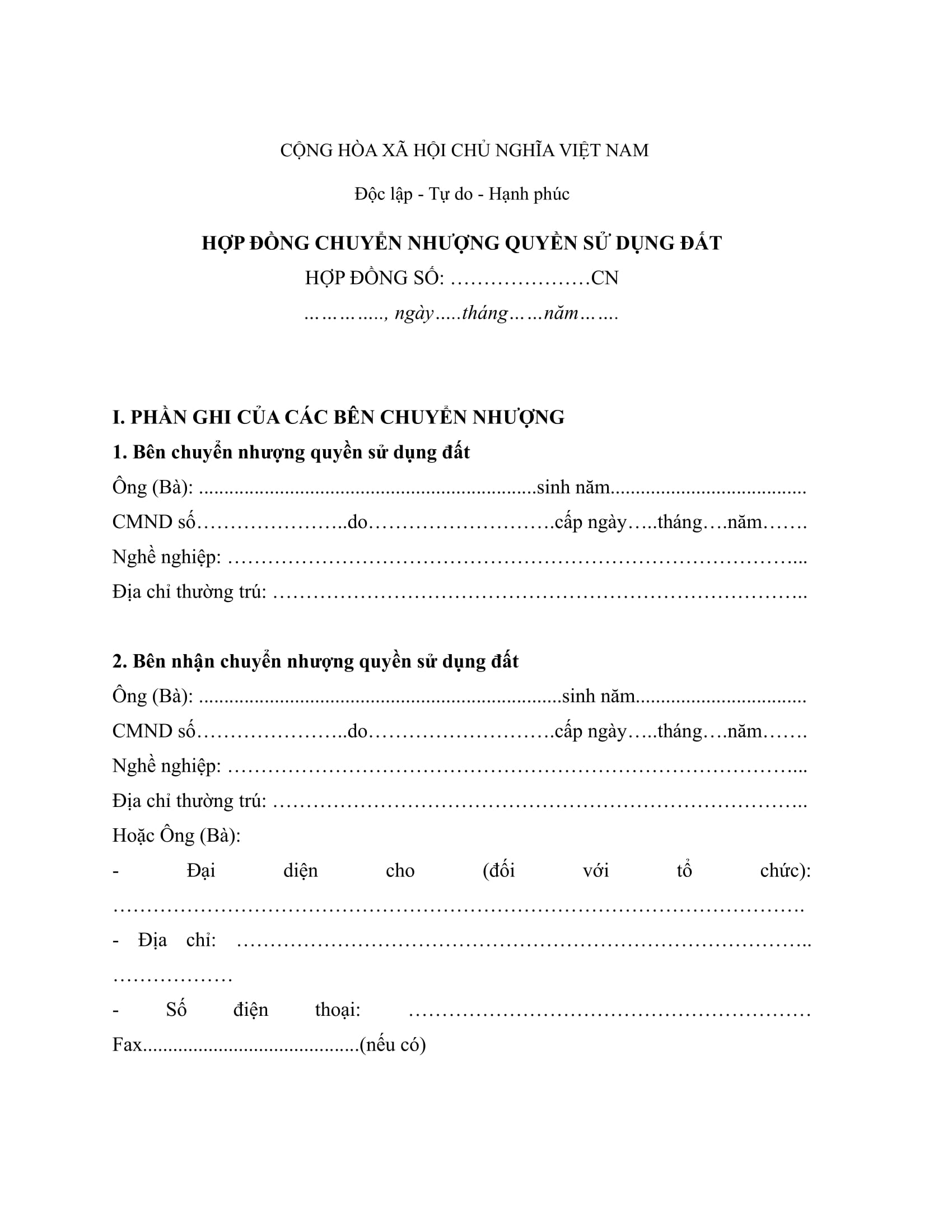 - Thông tin của bên chuyển nhượng và bên nhận chuyển nhượng: tên, số CMND…. ;
