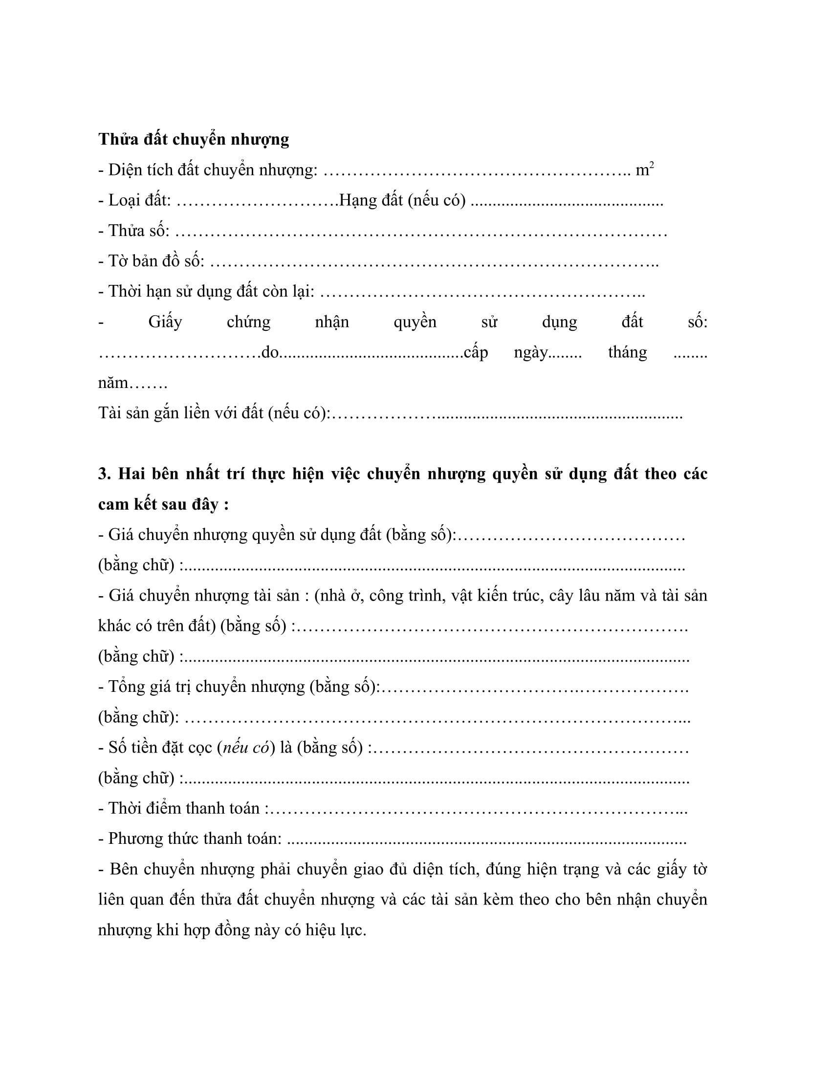 - Thông tin về thửa đất chuyển nhượng: loại đất, hạng đất, diện tích, vị trí, số hiệu, ranh giới và tình trạng đất; thời hạn sử dụng đất của bên chuyển nhượng; thời hạn sử dụng đất còn lại của bên nhận chuyển nhượng…