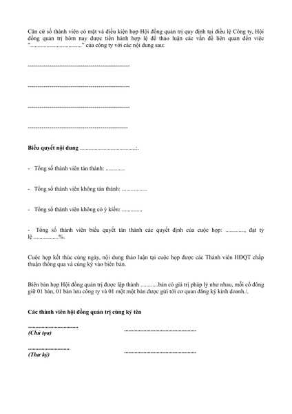 Biên bản họp Hội đồng quản trị được lập thành …………bản có giá trị pháp lý như nhau, mỗi cổ đông giữ 01 bản, 01 bản lưu công ty và 01 một một bản được gửi tới cơ quan đăng ký kinh doanh./.