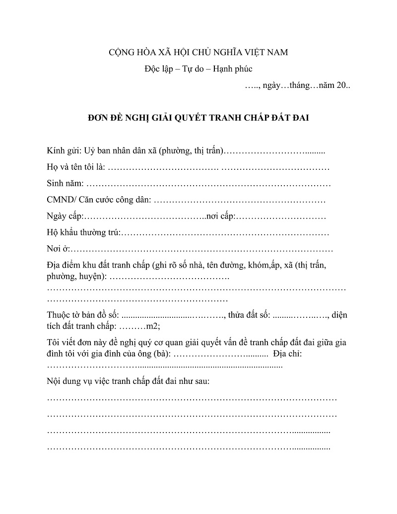 Mẫu đơn đề nghị giải quyết tranh chấp đất đai mới nhất