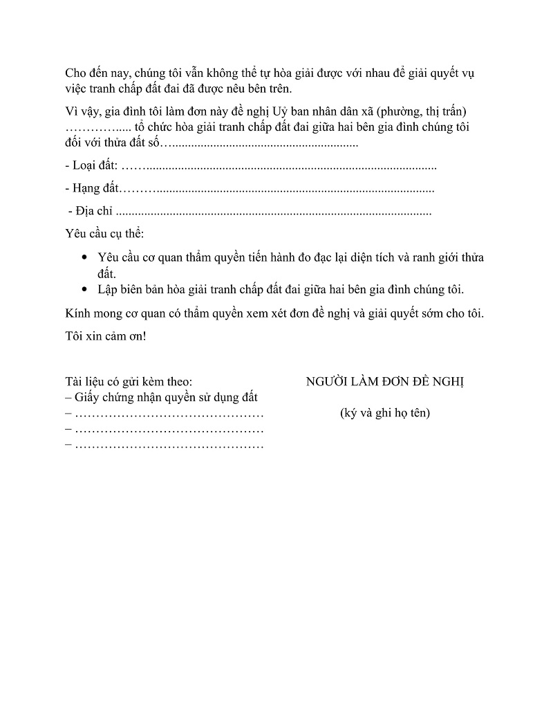 Vì vậy, gia đình tôi làm đơn này đề nghị Uỷ ban nhân dân xã (phường, thị trấn) …………….. tổ chức hòa giải tranh chấp đất đai giữa hai bên gia đình chúng tôi đối với thửa đất số……………………………………………………..