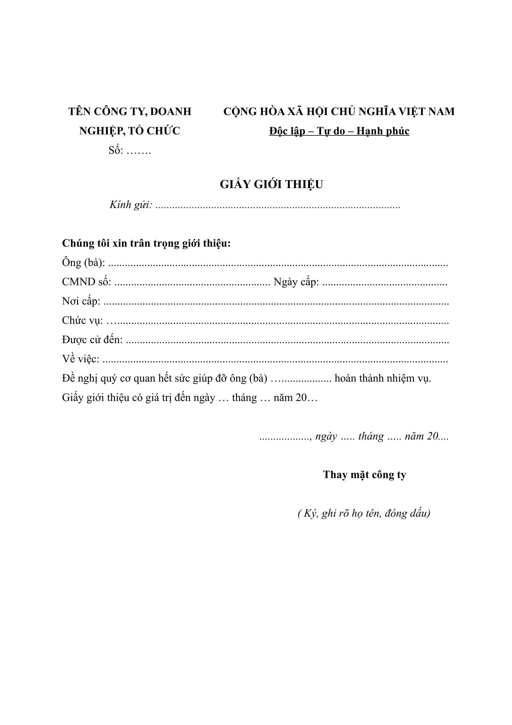 Giấy giới thiệu có giá trị đến ngày … tháng … năm 20…
