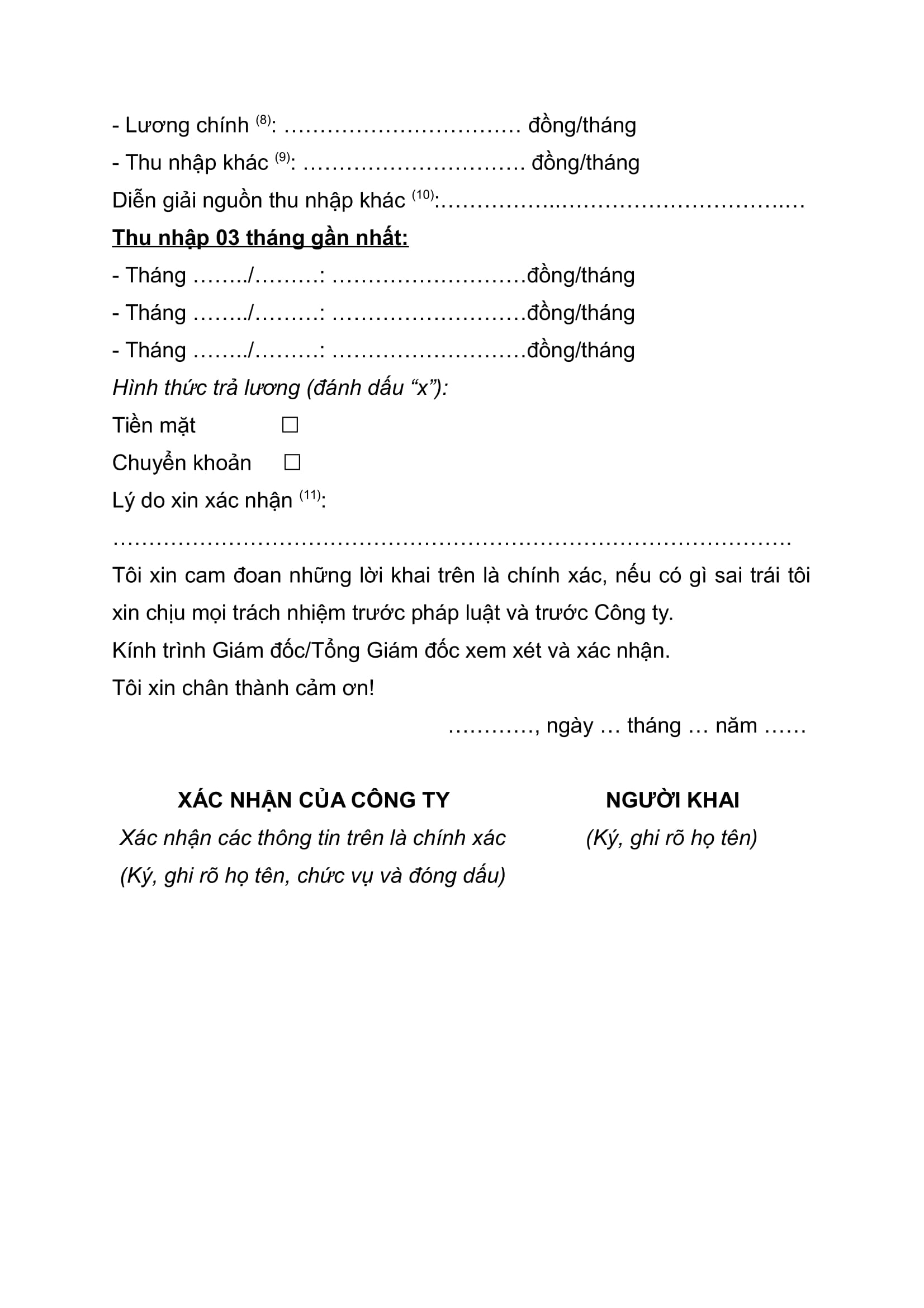 - Thông tin cụ thể về thu nhập: mức lương, hình thức trả, mức lương ba tháng gần nhất…