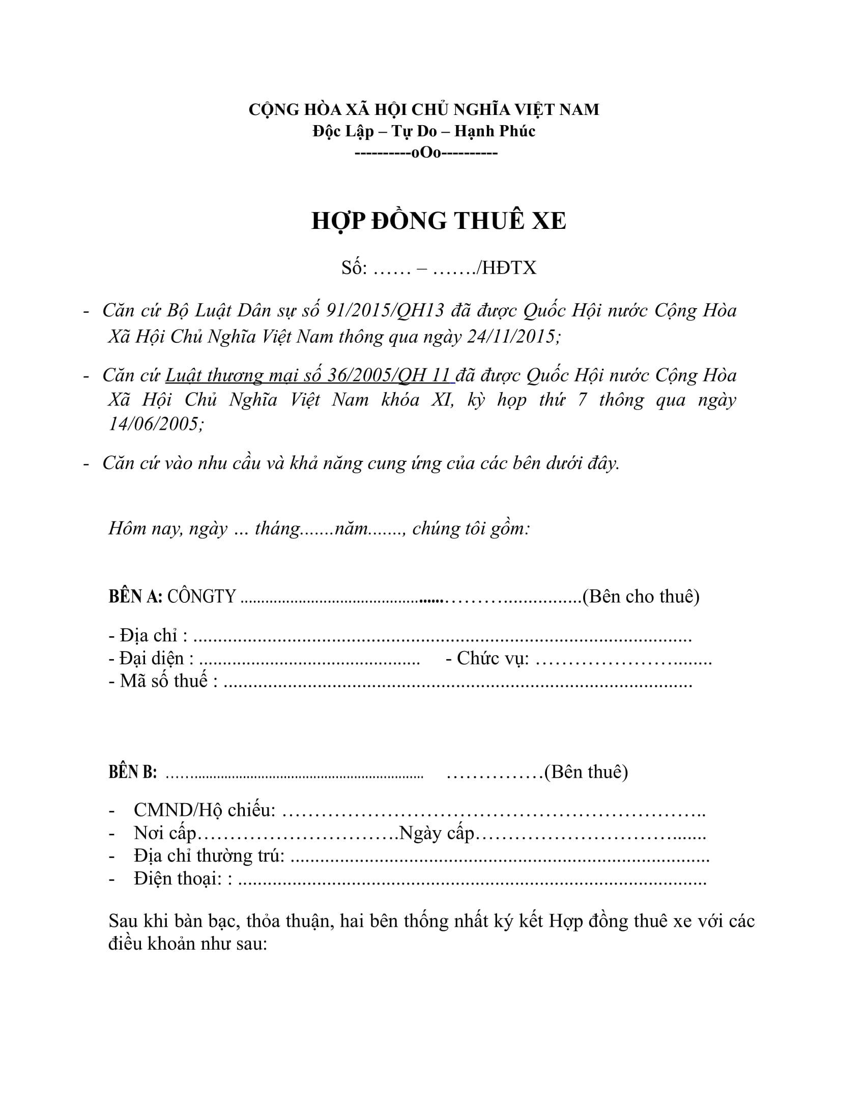 Sau đây là mẫu hợp đồng thuê xe kinh doanh của chúng tôi cung cấp: