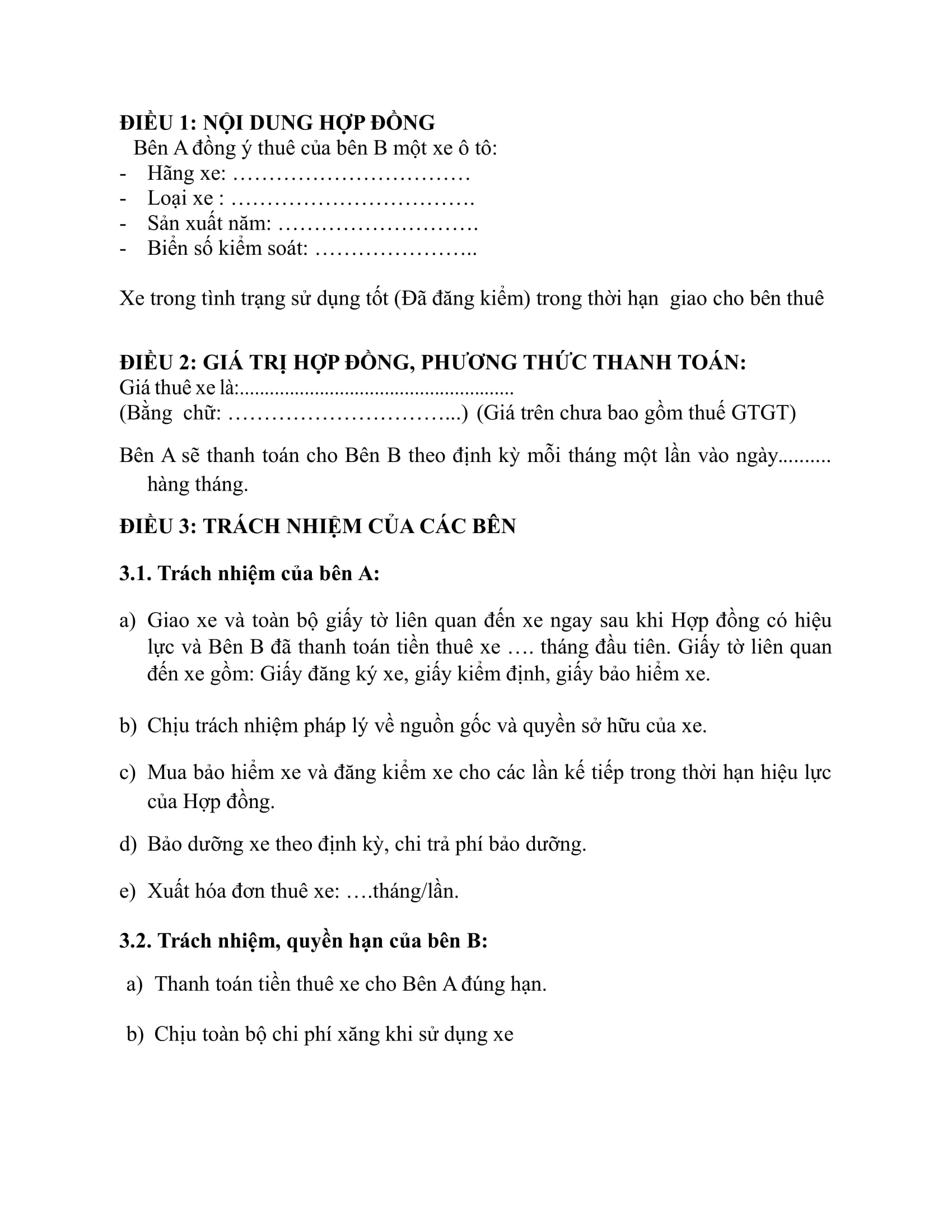 - Giao xe và toàn bộ giấy tờ liên quan đến xe ngay sau khi Hợp đồng có hiệu lực và Bên B đã thanh toán tiền thuê xe …. tháng đầu tiên. Giấy tờ liên quan đến xe gồm: Giấy đăng ký xe, giấy kiểm định, giấy bảo hiểm xe.