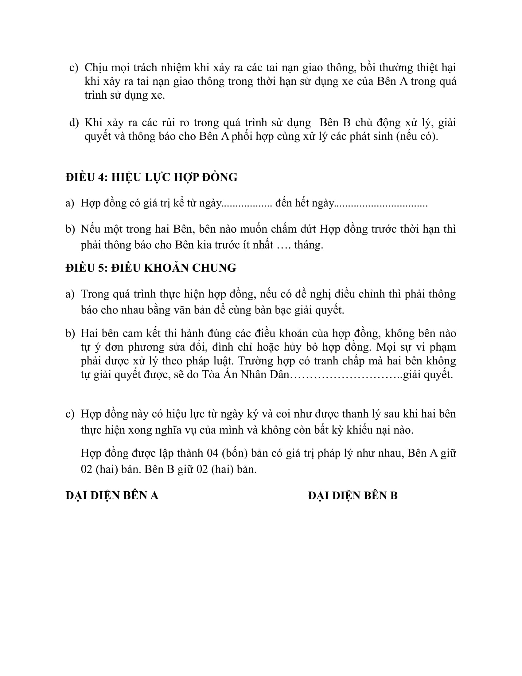 - Chịu mọi trách nhiệm khi xảy ra các tai nạn giao thông, bồi thường thiệt hại khi xảy ra tai nạn giao thông trong thời hạn sử dụng xe của Bên A trong quá trình sử dụng xe.