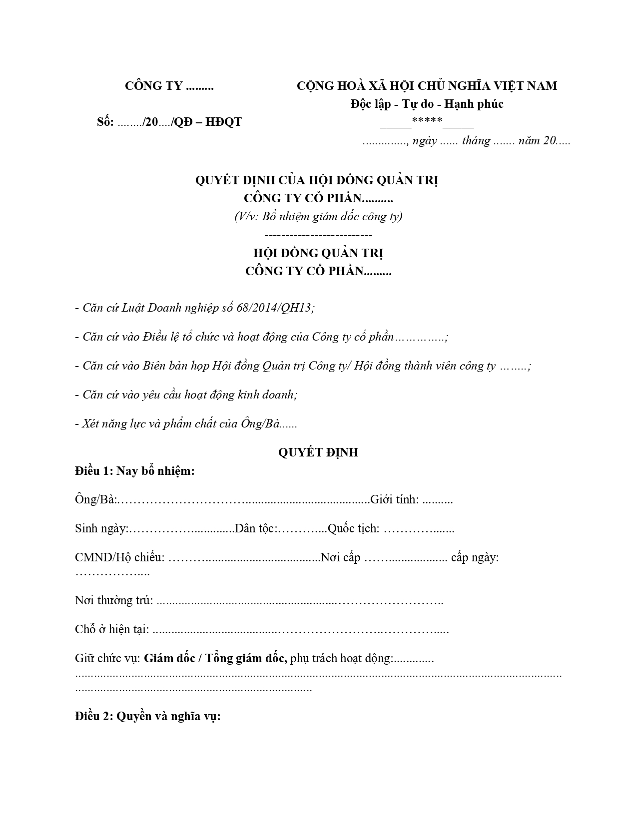 Số: ……../20…./QĐ – HĐQT
