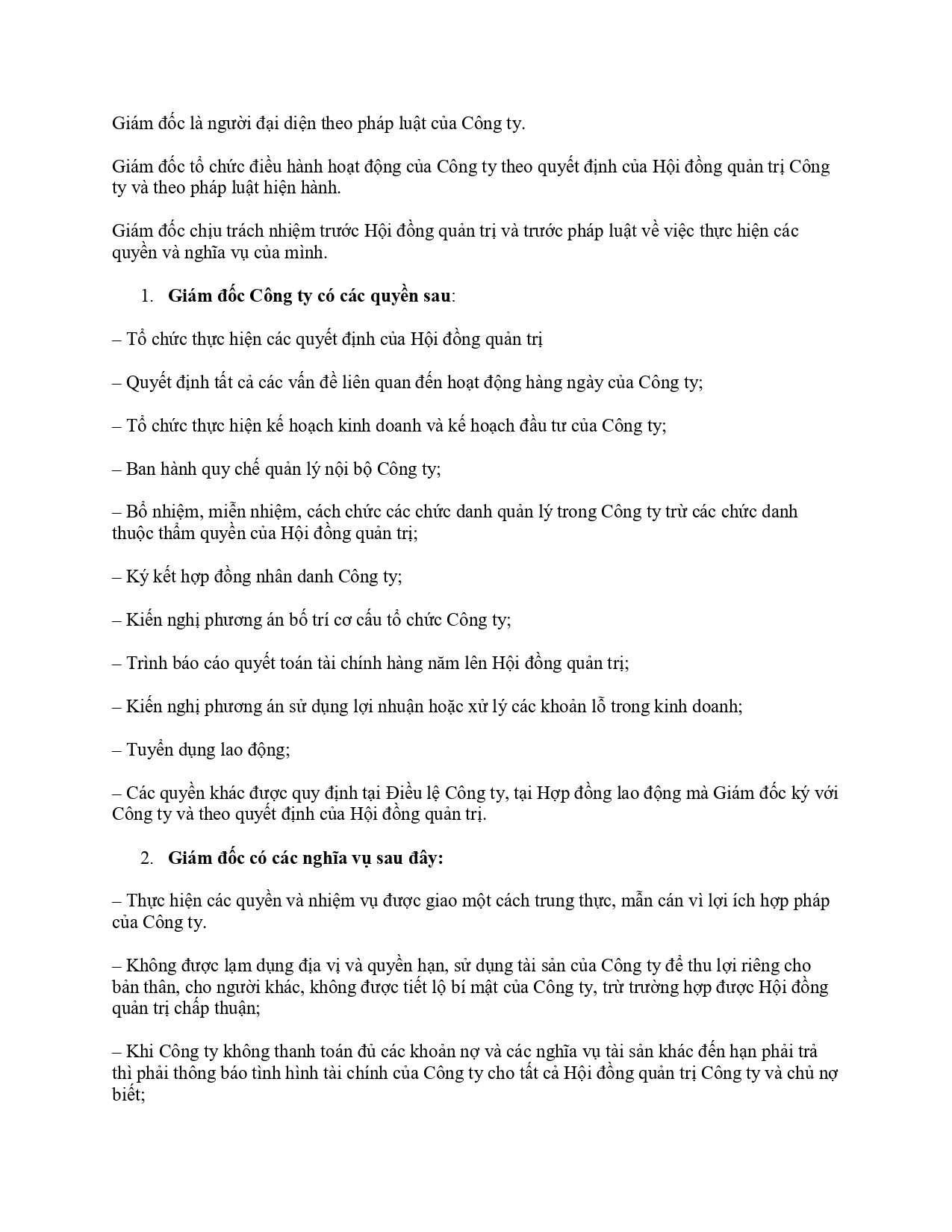 – Các quyền khác được quy định tại Điều lệ Công ty, tại Hợp đồng lao động mà Giám đốc ký với Công ty và theo quyết định của Hội đồng quản trị.