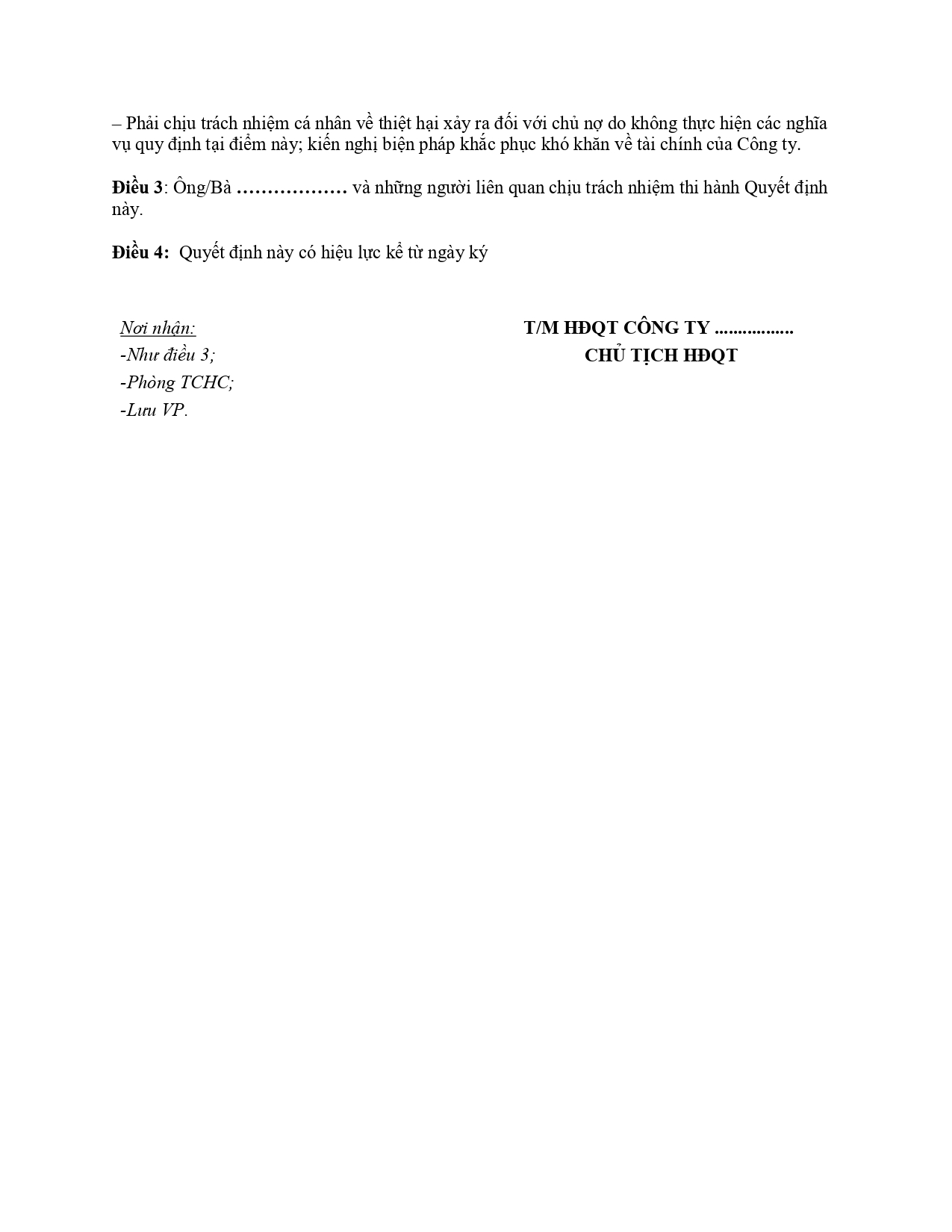 Điều 3: Ông/Bà ……………… và những người liên quan chịu trách nhiệm thi hành Quyết định này.