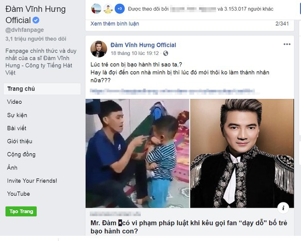 Cả fanpage chính thức và trang cá nhân mang tên Đàm Vĩnh Hưng đều có nhiều dòng lên án, kêu gọi người hâm mộ “dạy dỗ” người cha lộ clip bạo hành con ở Tiền Giang.
