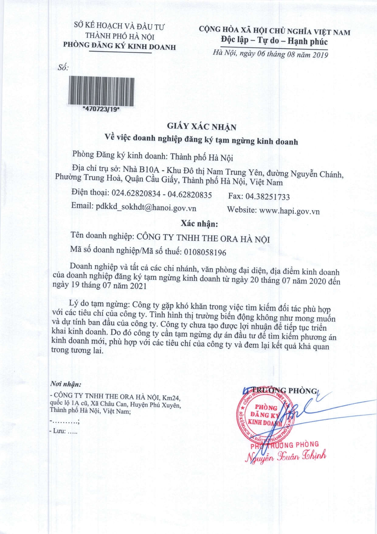 LSX HÂN HẠNH LÀ ĐƠN VỊ TƯ VẤN VÀ ĐẠI DIỆN THỰC HIỆN THỦ TỤC “TẠM NGỪNG KINH DOANH” CHO QUÝ CÔNG TY TNHH THE ORA