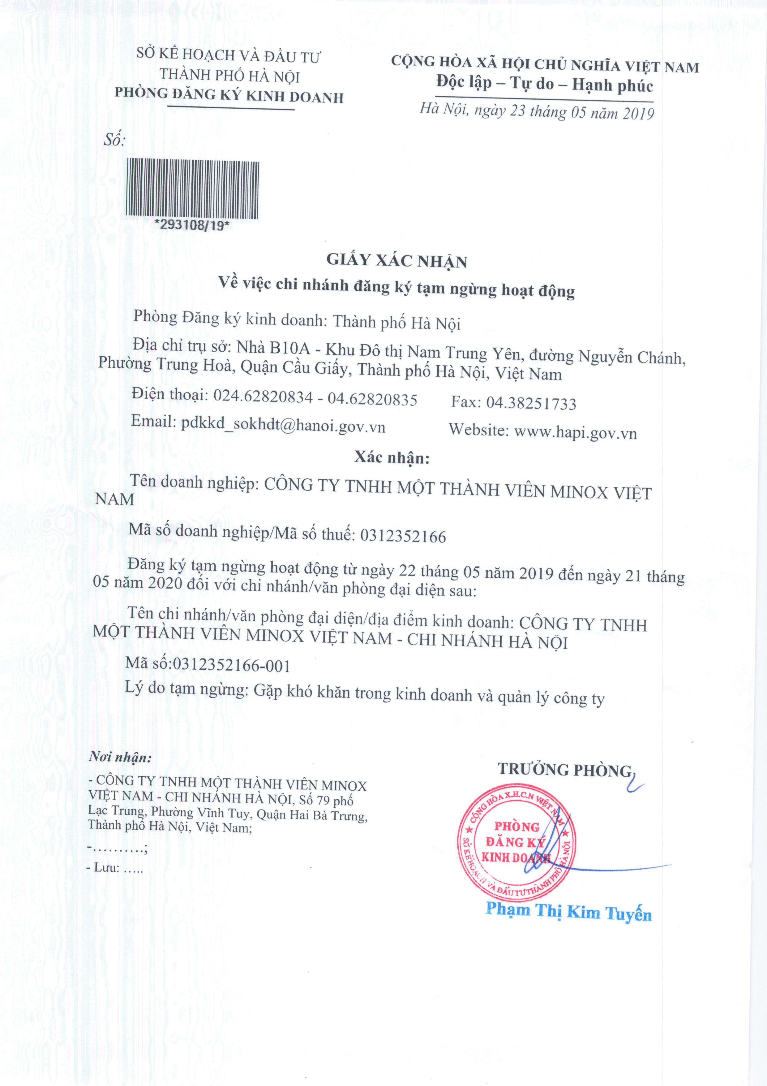 LSX HÂN HẠNH LÀ ĐƠN VỊ TƯ VẤN VÀ ĐẠI DIỆN THỰC HIỆN THỦ TỤC “TẠM NGƯNG KINH DOANH” CHO QUÝ CÔNG TY TNHH MỘT THÀNH VIÊN MINOX VIỆT NAM