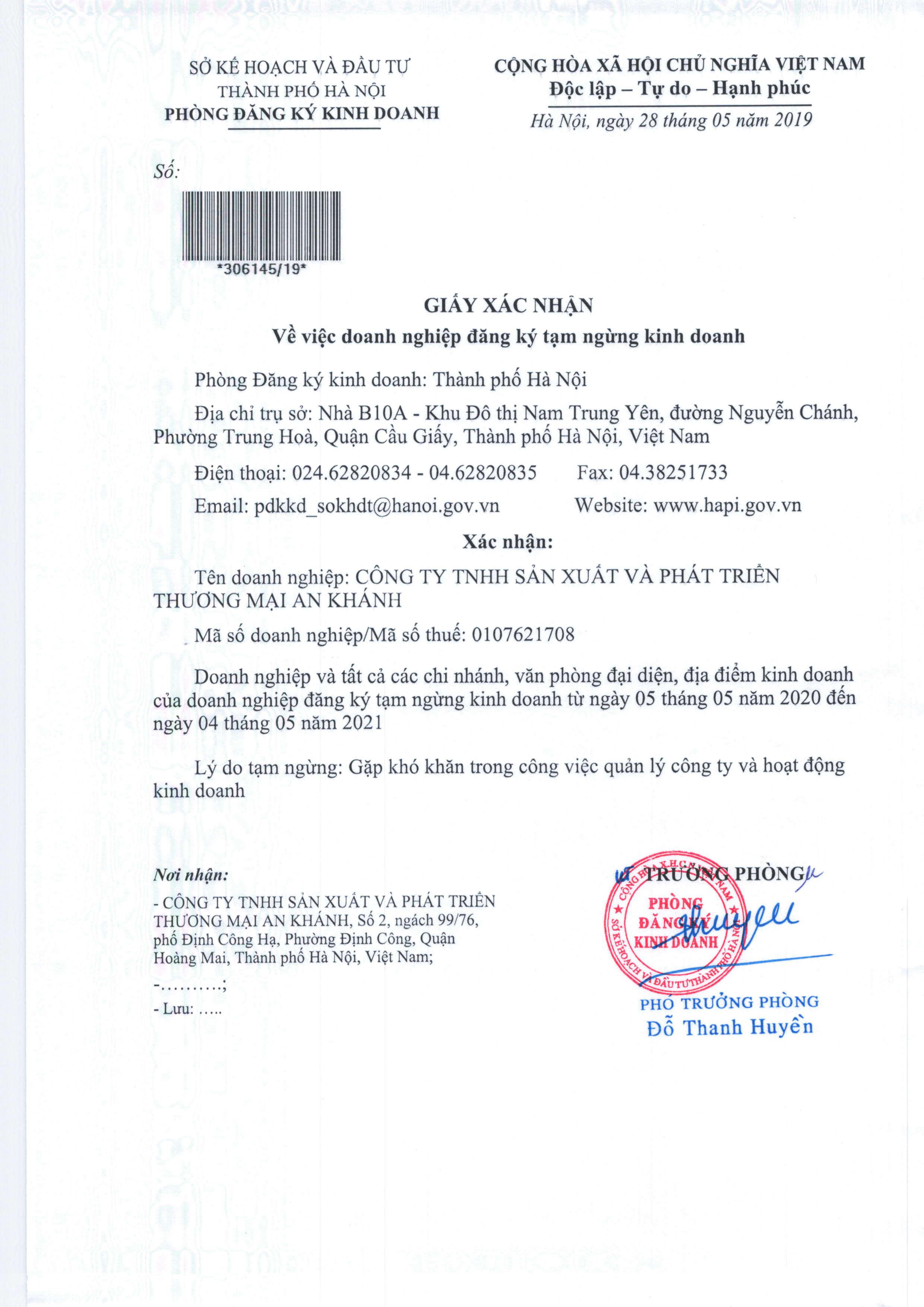 LSX HÂN HẠNH LÀ ĐƠN VỊ TƯ VẤN VÀ ĐẠI DIỆN THỰC HIỆN THỦ TỤC “TẠM NGƯNG KINH DOANH” CHO QUÝ CÔNG TY TNHH SẢN XUẤT VÀ PHÁT TRIỂN THƯƠNG MẠI AN KHÁNH Năm thứ hai