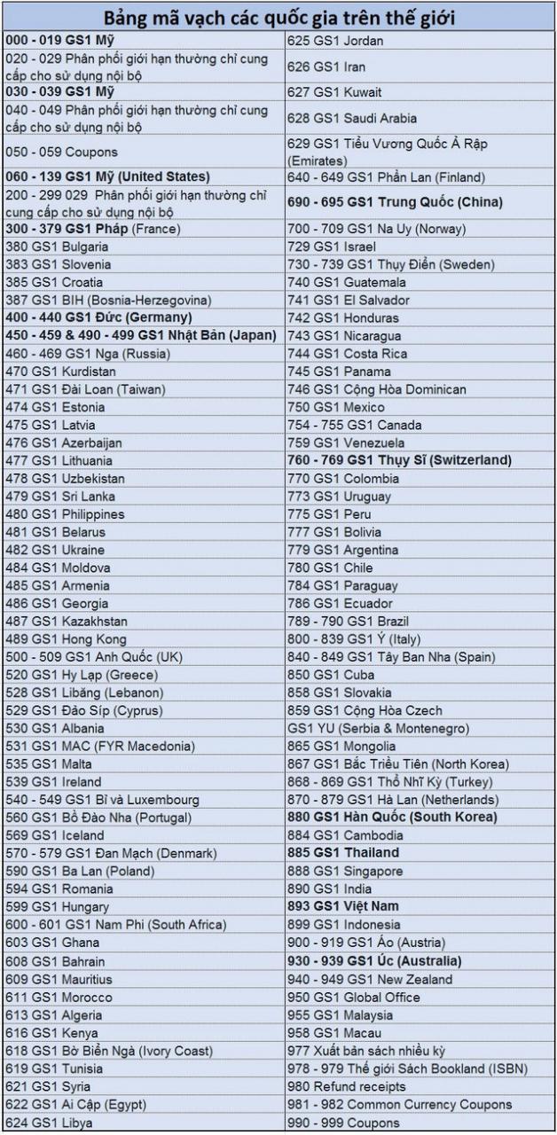 Xem 3 chữ số đầu tiên của mã vạch và đối chiếu với bảng hệ thống mã vạch quy chuẩn dưới đây để biết được xuất xứ quốc gia của mặt hàng.