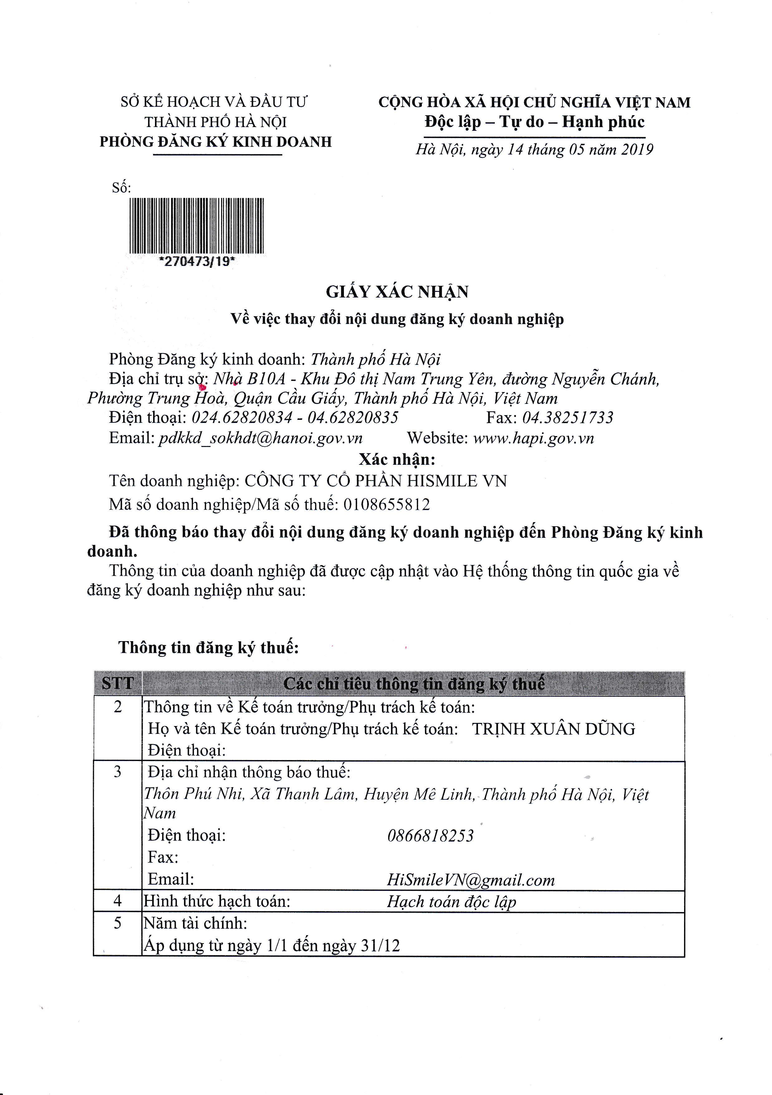 CÔNG TY CỔ PHẦN HISMILE VN đã cập nhật vào Hệ thống thông tin quốc gia về đăng ký doanh nghiệp ( như ảnh kèm theo)