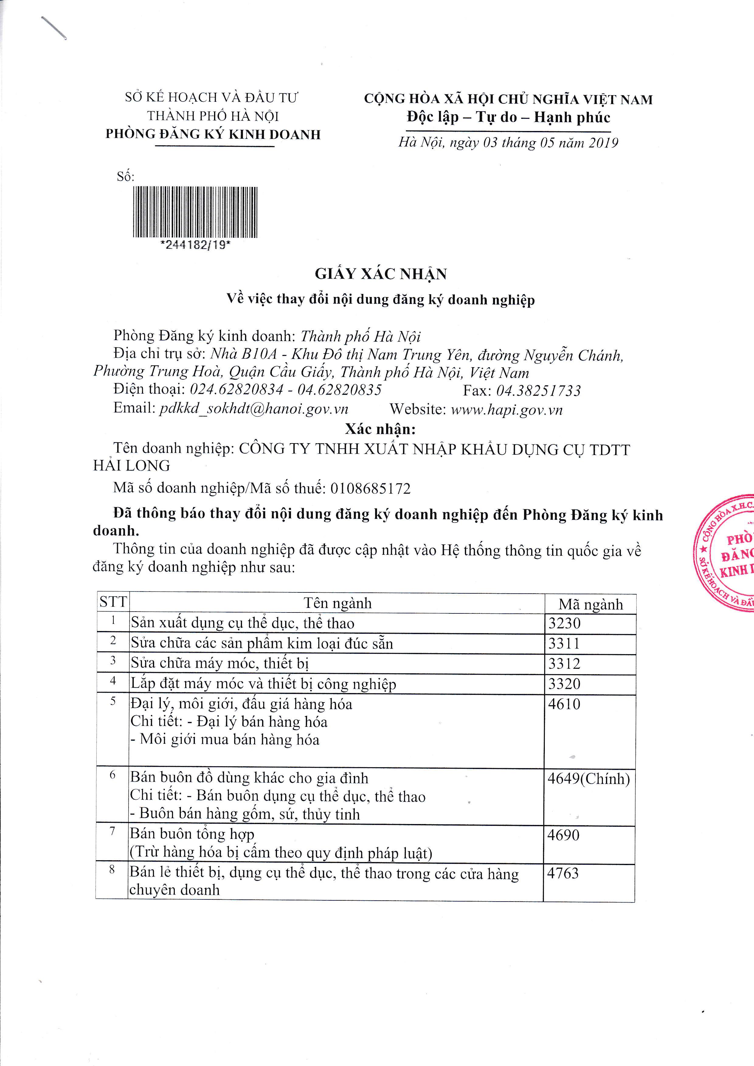 LSX HÂN HẠNH LÀ ĐƠN VỊ HỖ TRỢ VÀ ĐẠI DIỆN THỰC HIỆN THỦ TỤC THAY ĐỔI NỘI DUNG ĐĂNG KÍ DOANH NGHIỆP CHO “CÔNG TY TNHH XUẤT NHẬP KHẨU DỤNG CỤ TDTT HẢI LONG