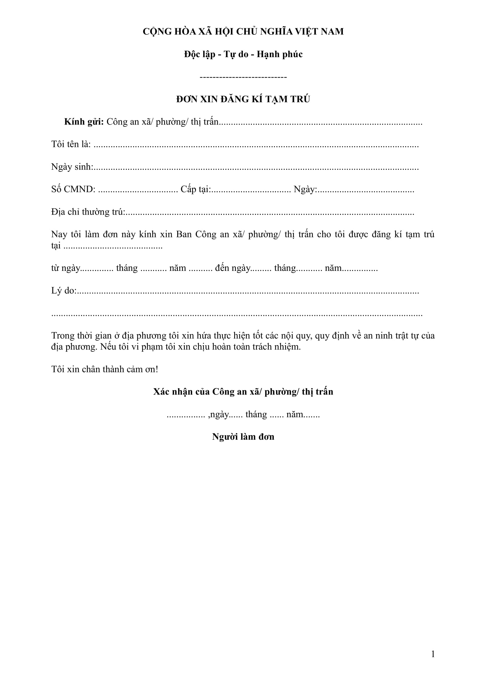 Nay tôi làm đơn này kính xin Ban Công an xã/ phường/ thị trấn cho tôi được đăng kí tạm trú tại …………………………………..