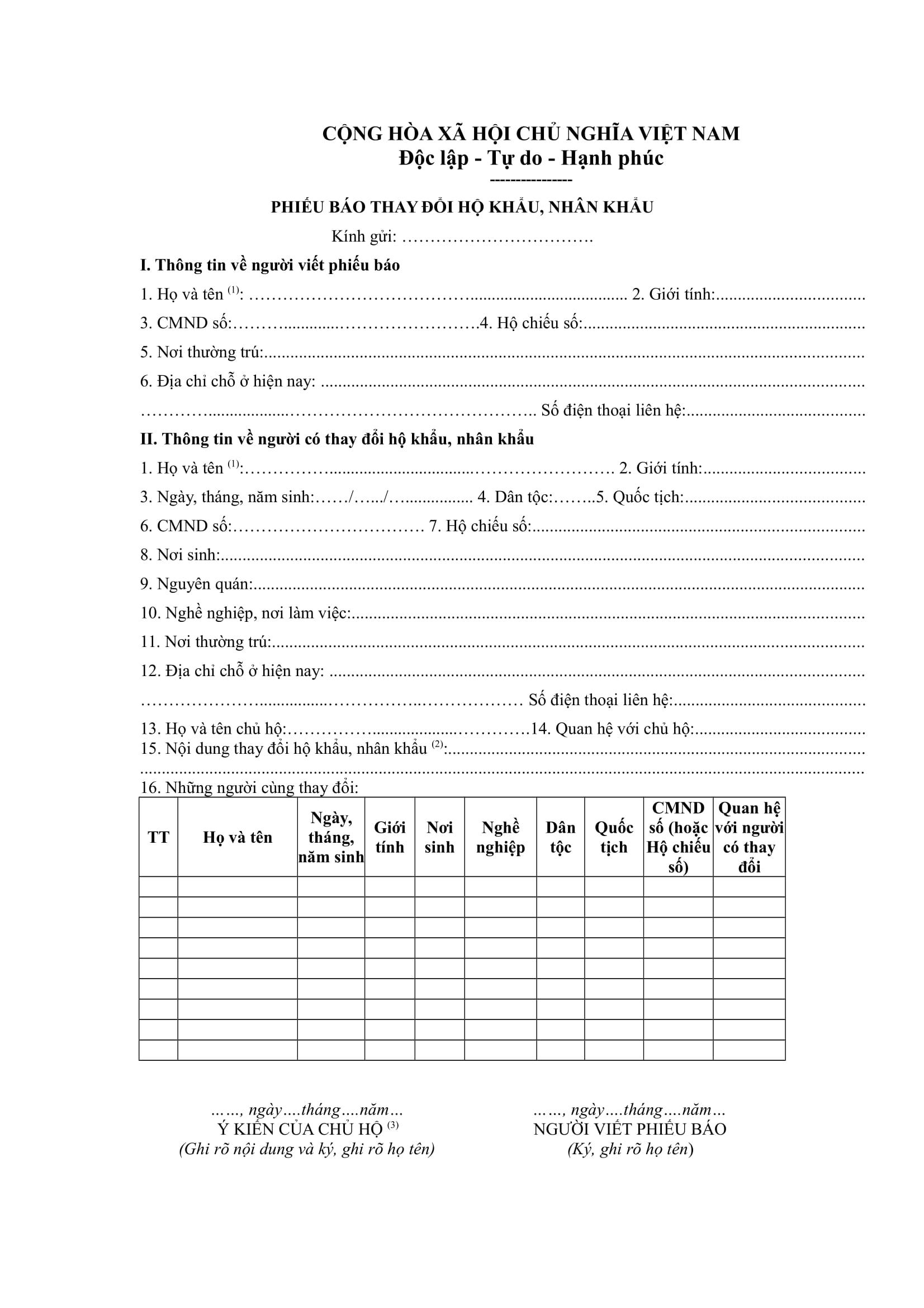 PHIẾU BÁO THAY ĐỔI HỘ KHẨU, NHÂN KHẨU