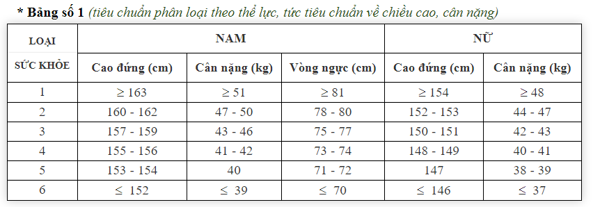 Việc phân loại sức khỏe phải căn cứ vào 3 bảng tiêu chuẩn sức khỏe gồm: