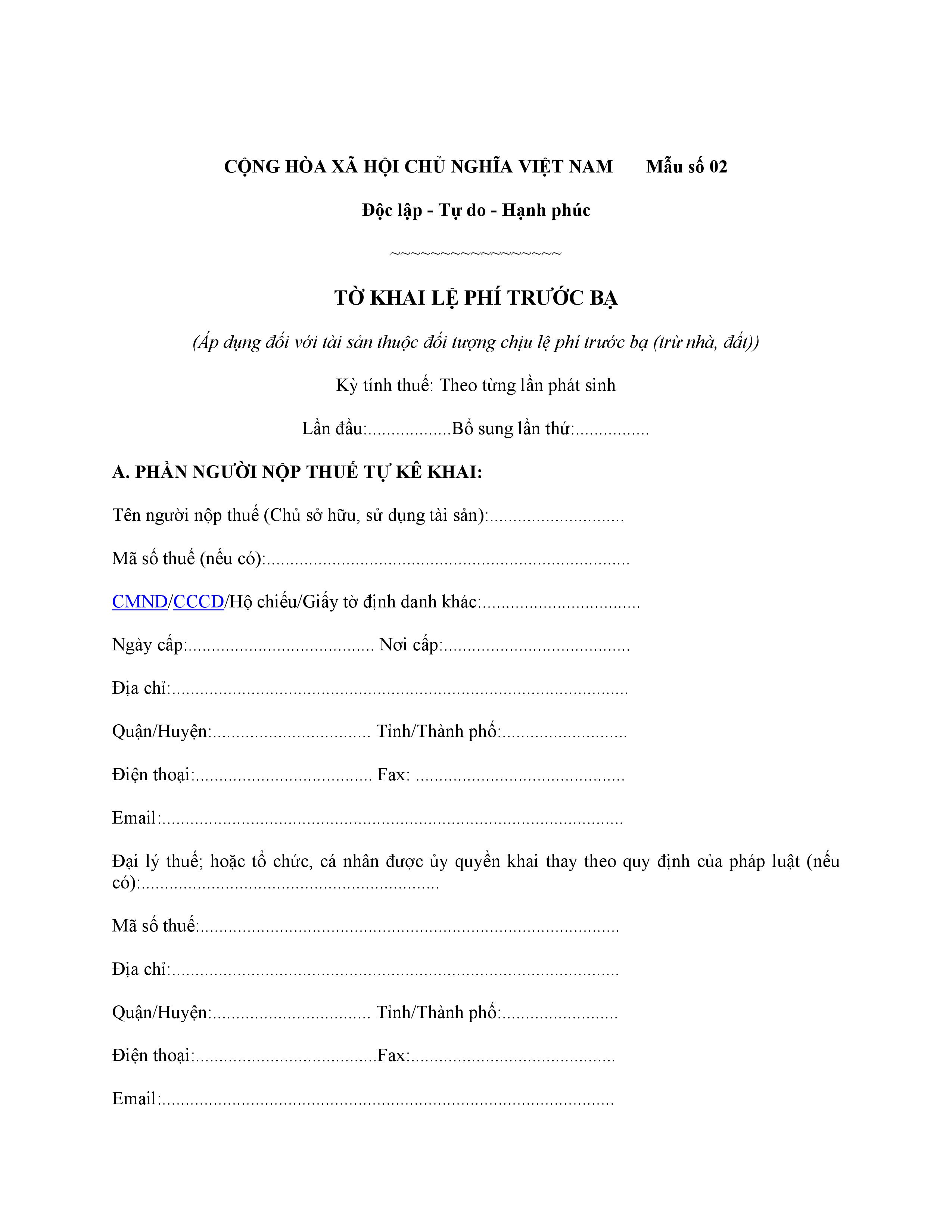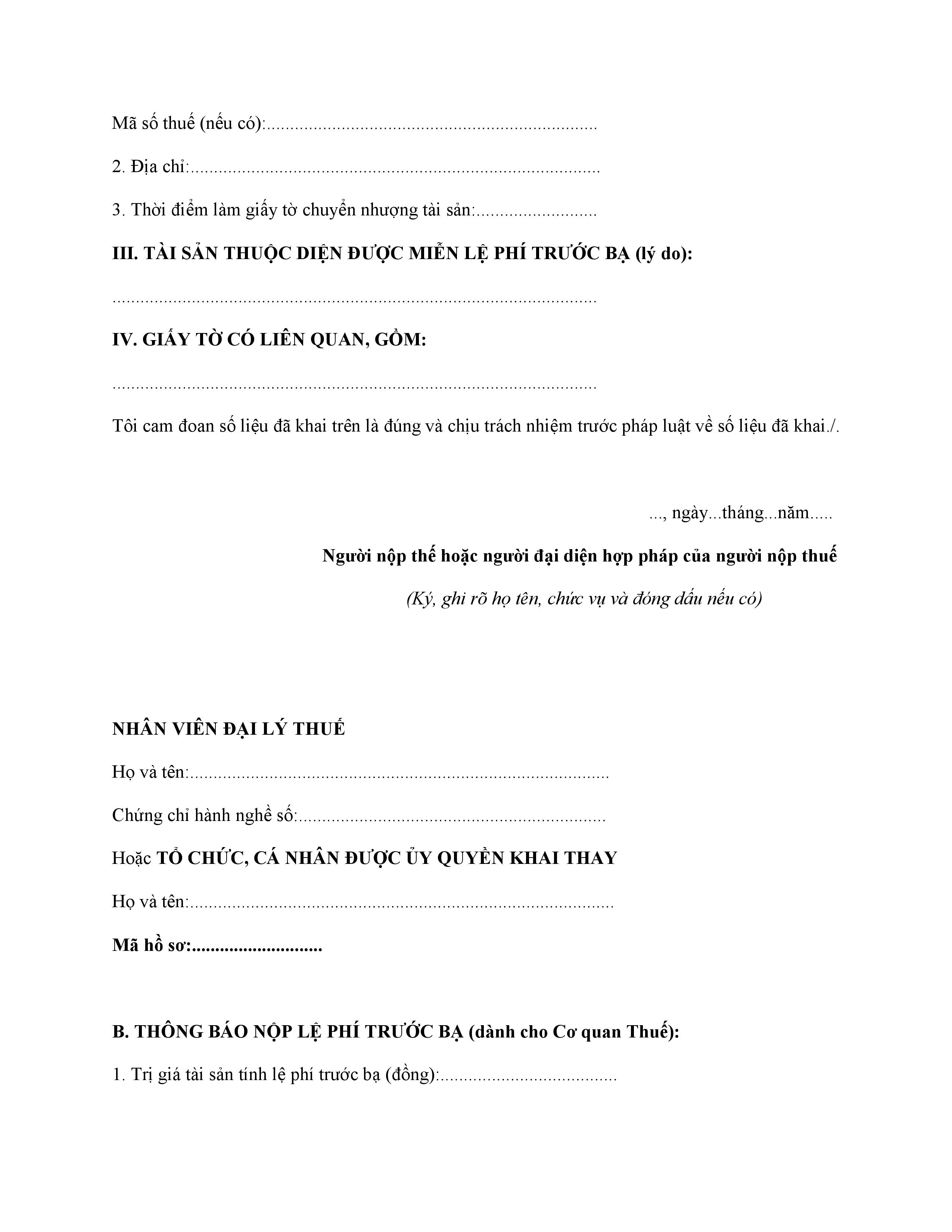 TỜ KHAI LỆ PHÍ TRƯỚC BẠ