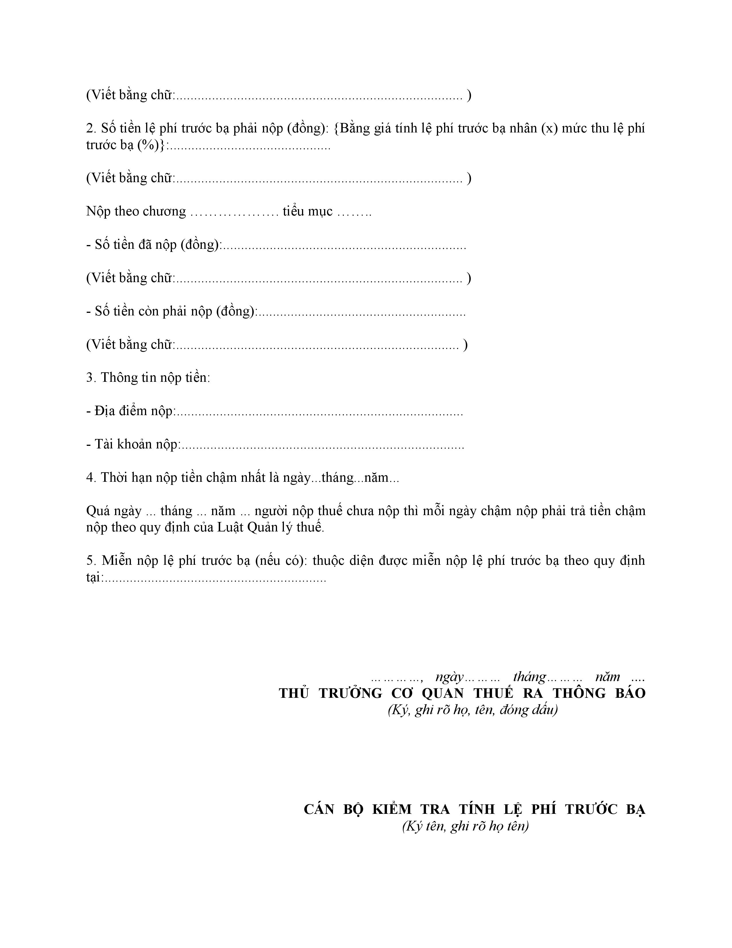 B. THÔNG BÁO NỘP LỆ PHÍ TRƯỚC BẠ (dành cho Cơ quan Thuế):
