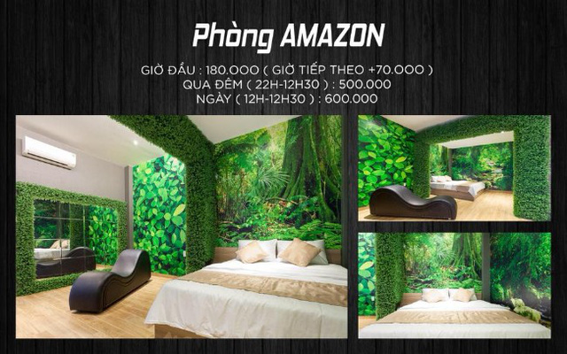 Chủ nhân khách sạn cũng cho biết, giá bdsm room, jav room, fifty shades room, glass room và amazon room một giờ đầu là 180 ngàn đồng (thêm 70 ngàn đồng cho giờ tiếp theo). Nếu qua đêm từ 22 giờ đến 12 giờ 30 trưa hôm sau thì giá phòng là 500.000 đồng, hoặc 600.000 đồng khi ở nguyên ngày đêm từ 12 giờ đến 12 giờ 30 hôm sau…
